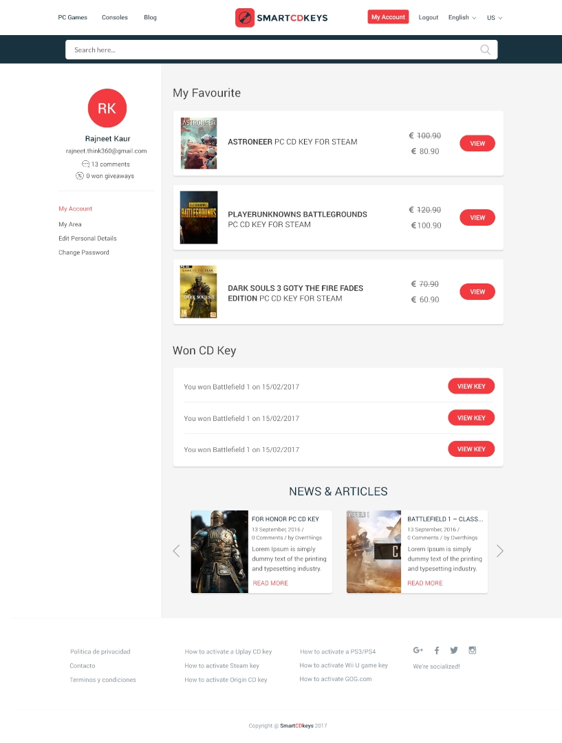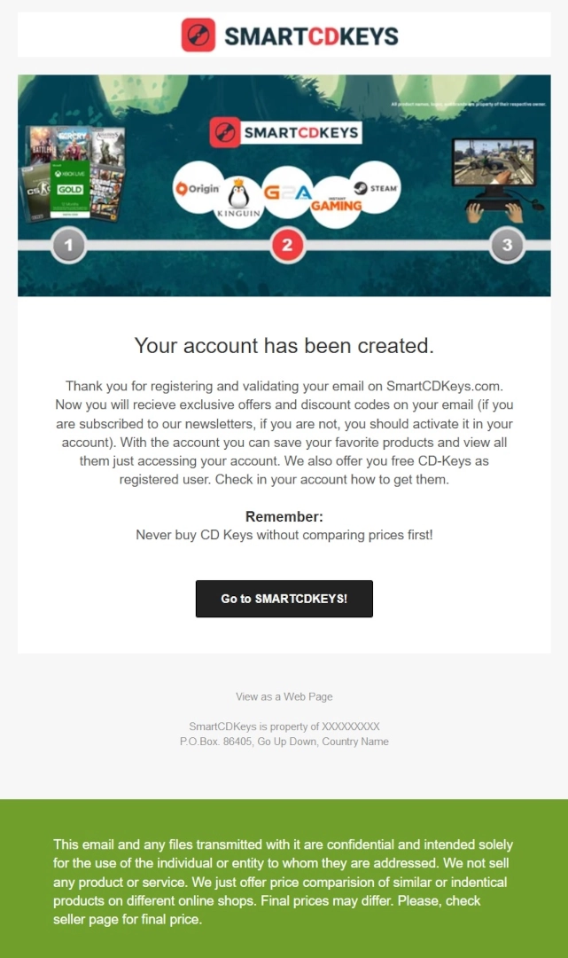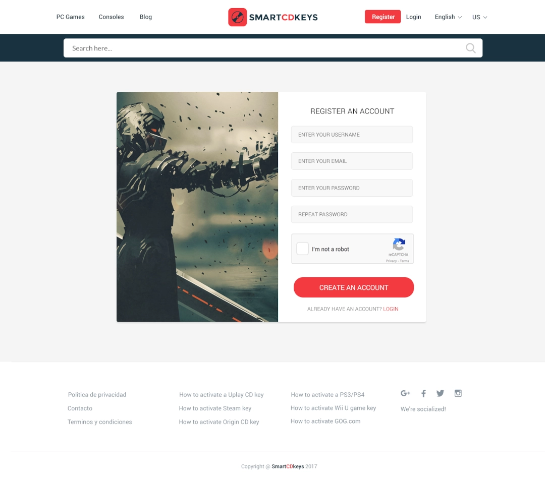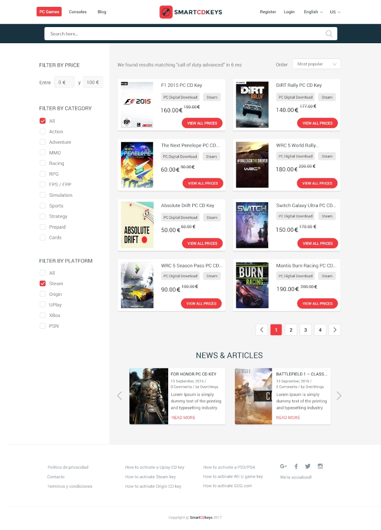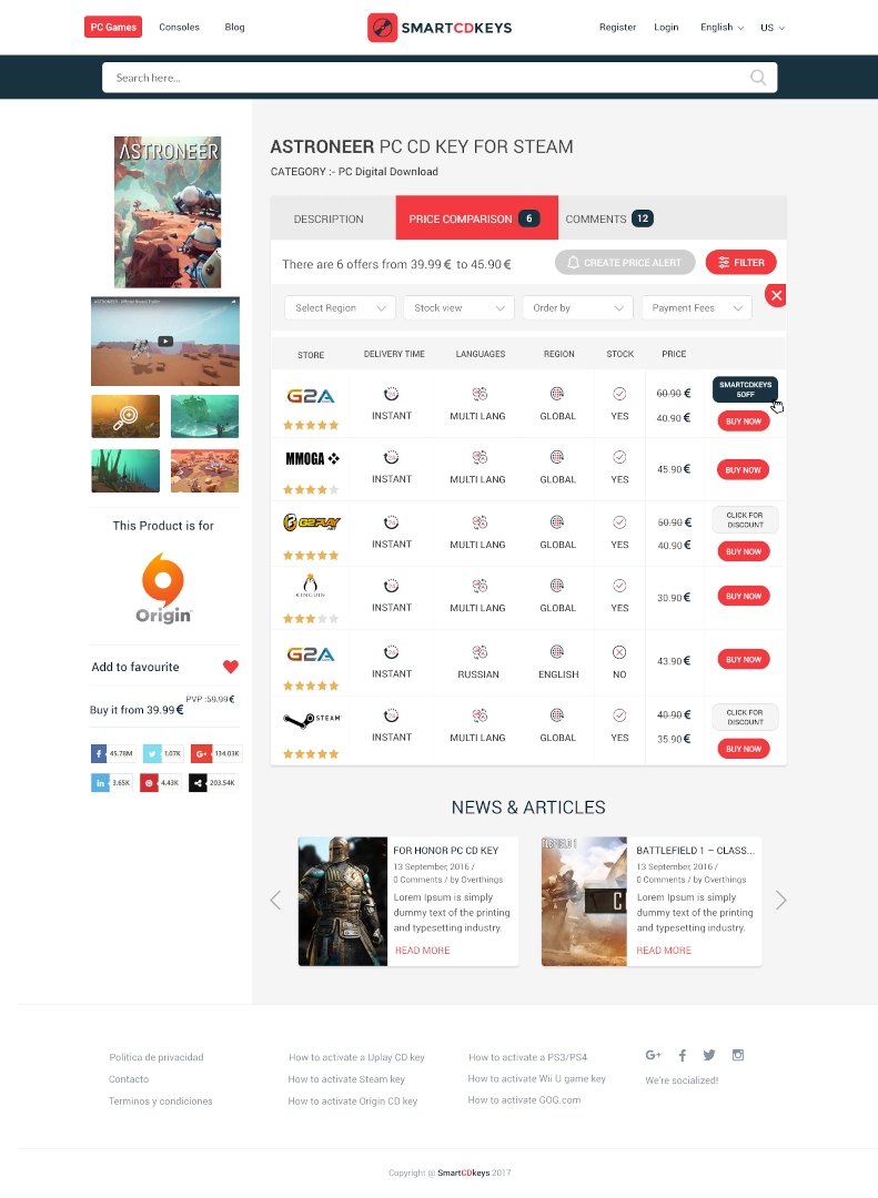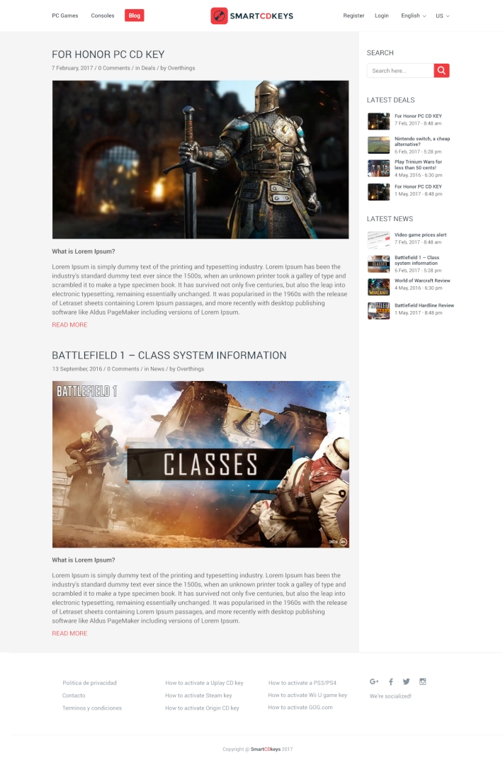 SmartCDKeys es un comparador de precios de videojuegos, que permite a los usuarios encontrar las mejores ofertas de juegos de forma rápida y sencilla. La web también ofrece un blog con noticias y análisis de juegos, así como un foro donde los usuarios pueden compartir sus opiniones y experiencias. Además ofrece a los clientes la posibilidad de comprar claves de CD para juegos de PC a un precio muy reducido. Las claves se pueden utilizar para activar los juegos en las plataformas Steam, Origin y Uplay.